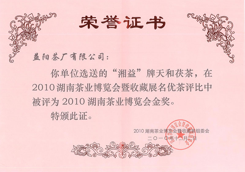 2010年湖南省茶業(yè)博覽會金獎