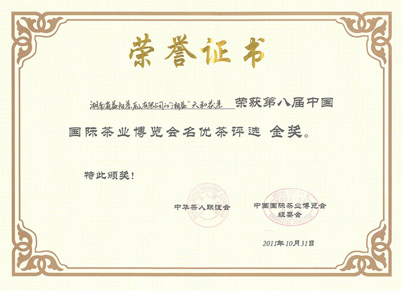 茯茶獲第八屆國際茶博會(huì)金獎(jiǎng)(天和)